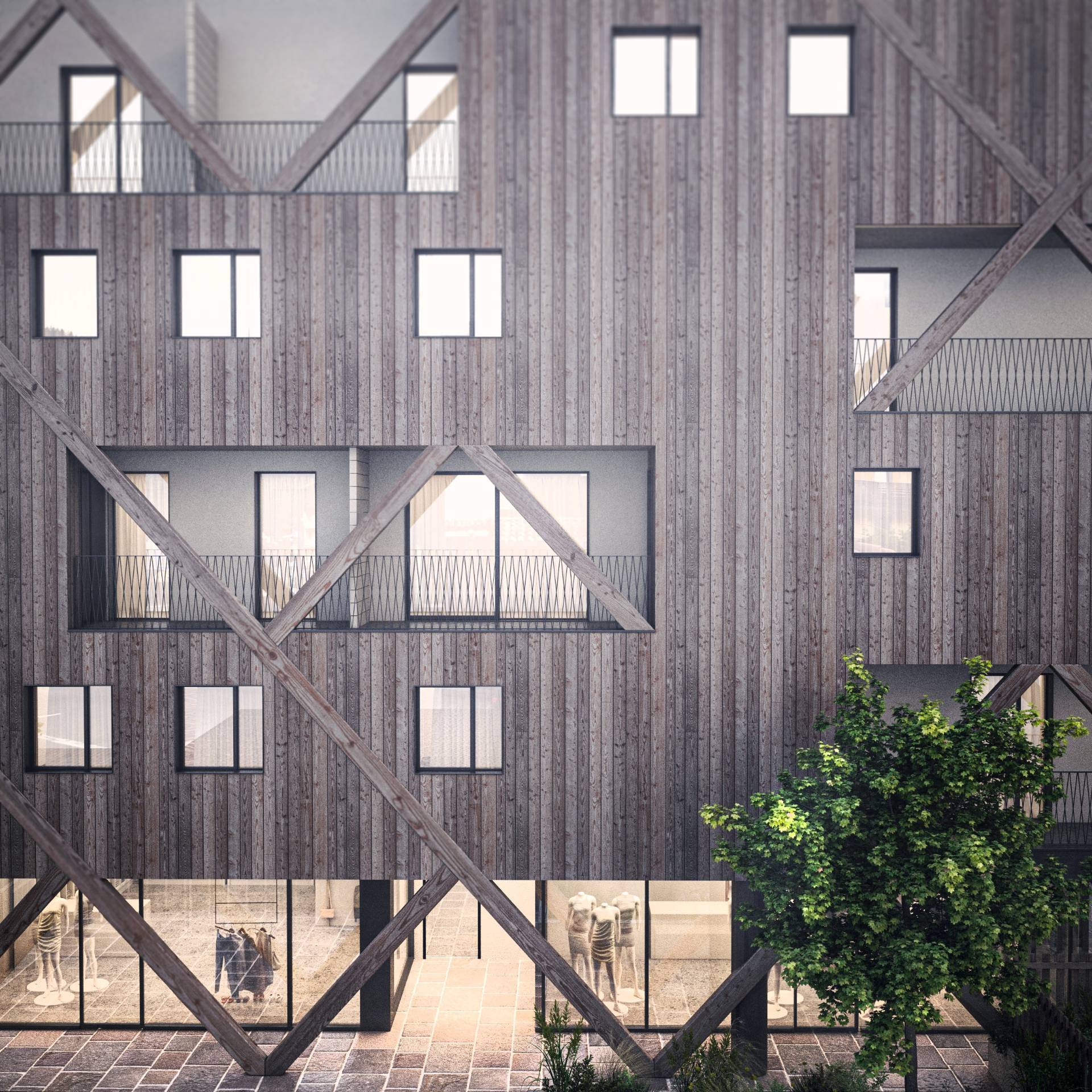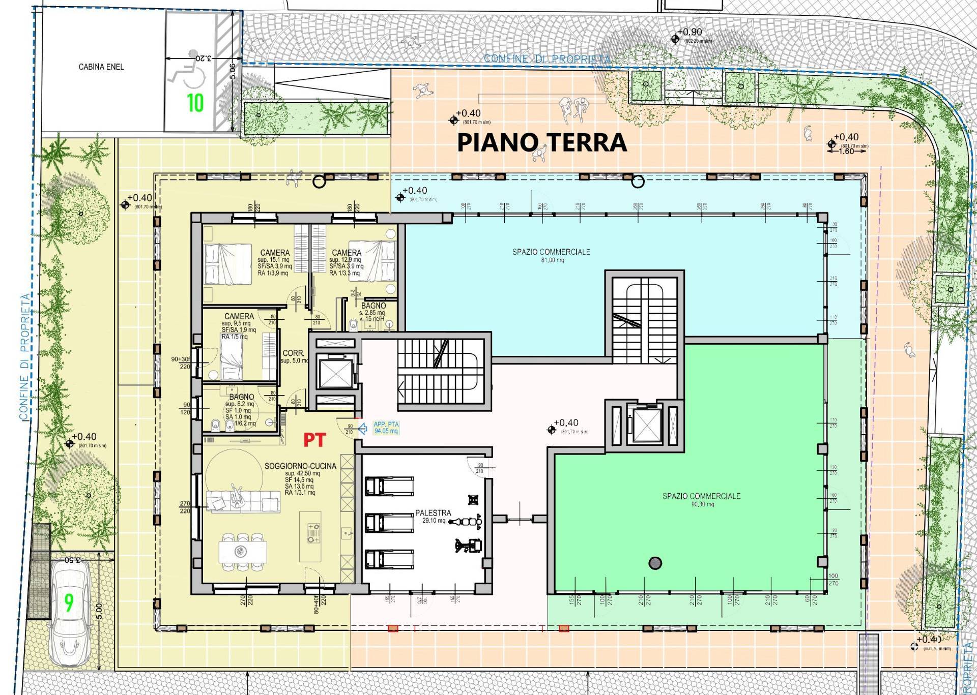 Al piano terra è previsto un appartamento e due spazi commerciali.