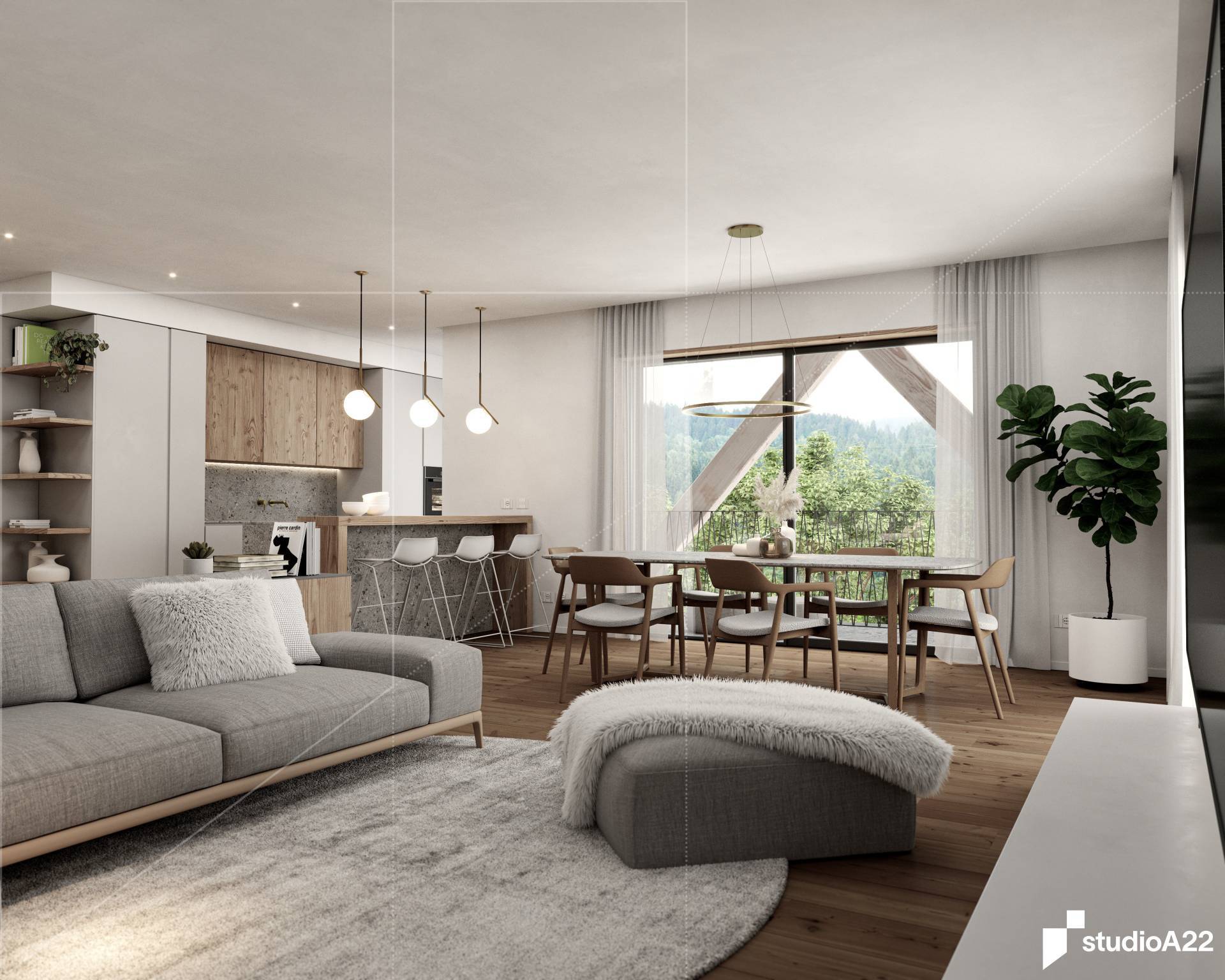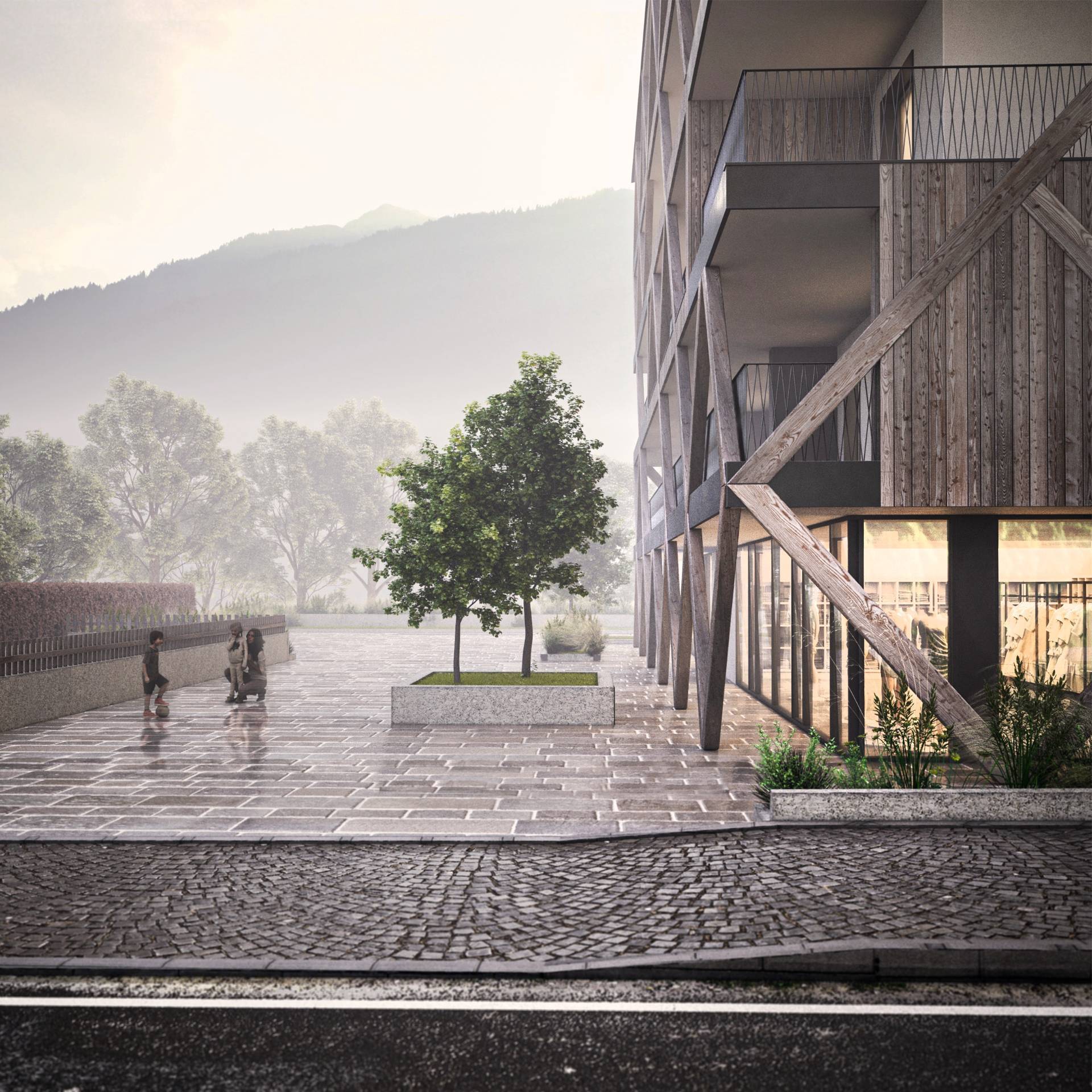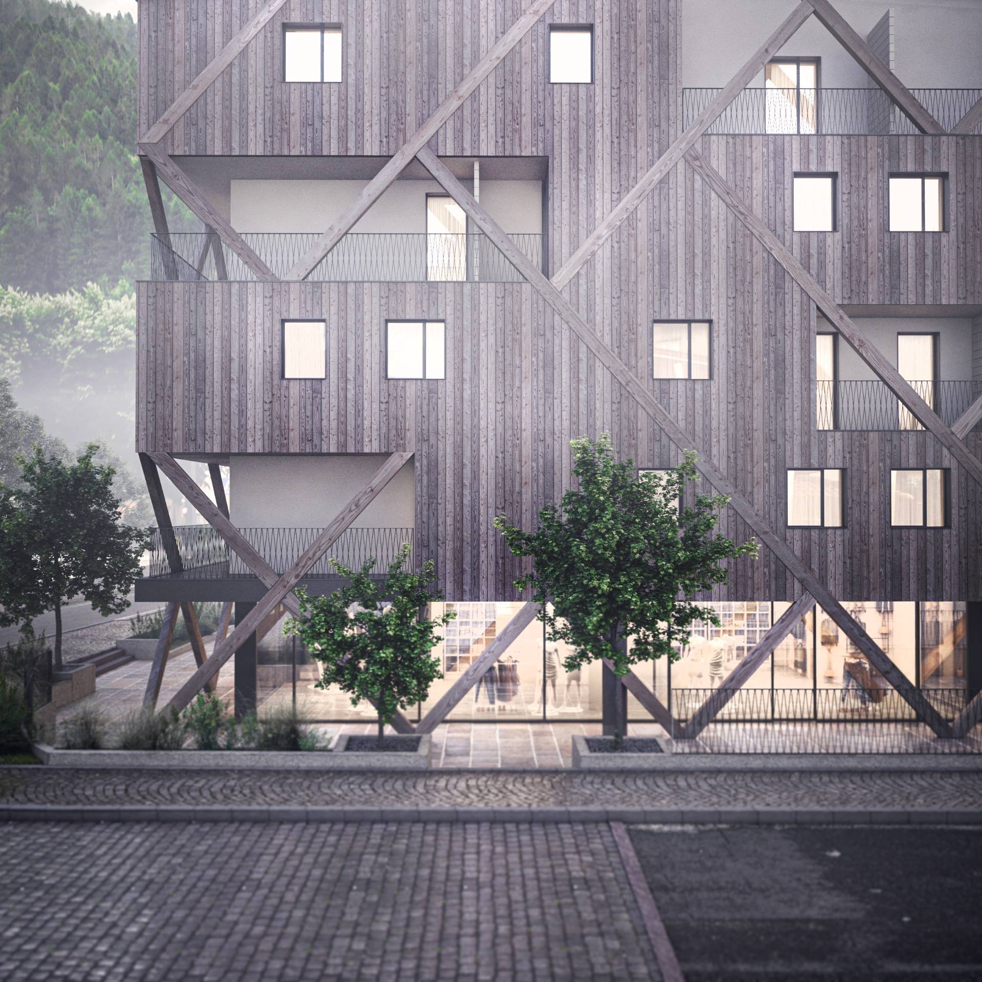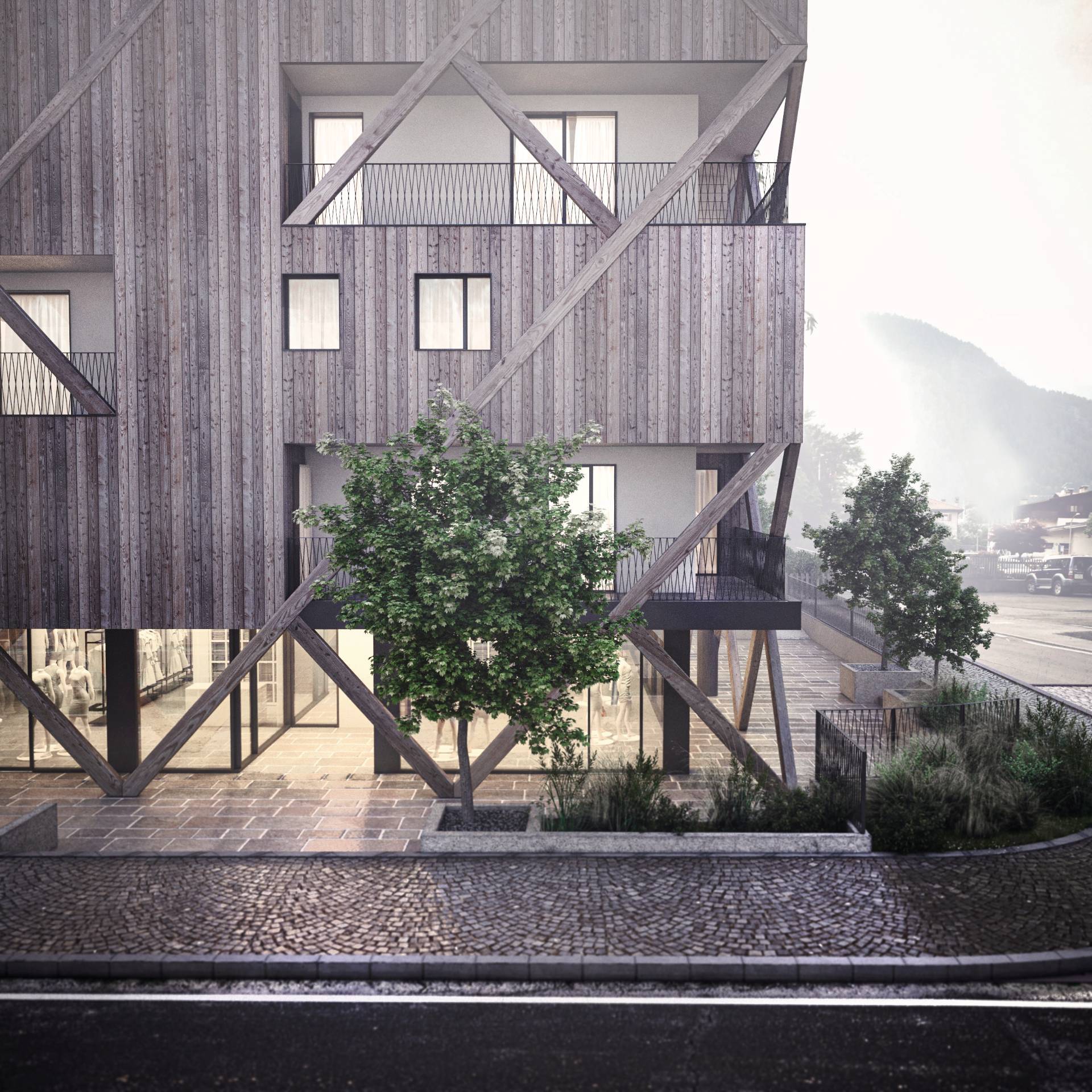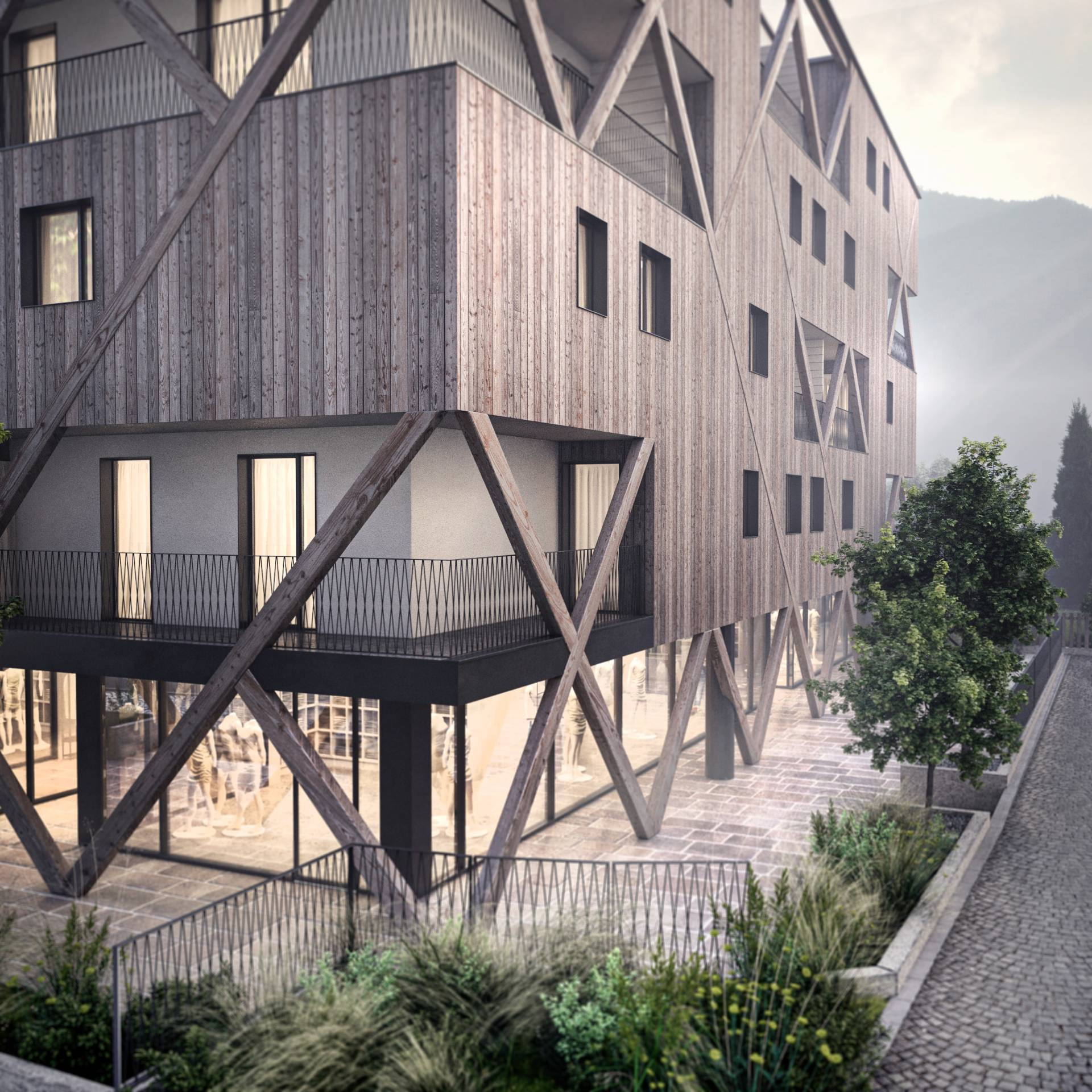 Il carattere saliente dell’edificio sarà definito dall’evidente richiamo all’architettura alpina, aspetto che è stato ricercato con un approfondito studio del contesto ed una analisi delle radici dei caratteri compositivi facenti parte della tradizione locale.